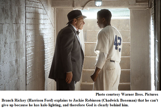 42 shoots its message at the audience with gaudy dialogue and lighting. Most of it is religious. Early in the film, manager Branch Rickey (Harrison Ford) makes Robinson into a Jesus analogue, and he never stops talking about God from there. Halo lighting is used exorbitantly to make sure the audience knows how Godly and glorious everything is.