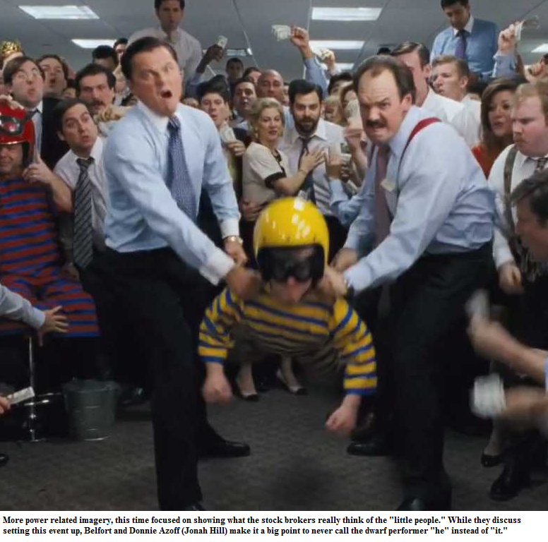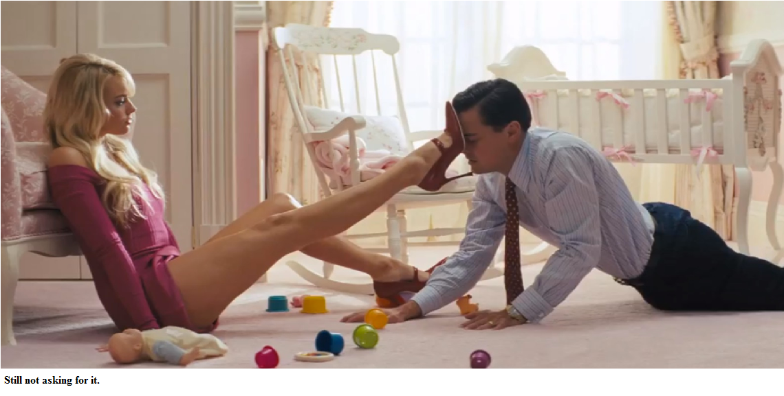 Belfort repeatedly tells his employees to never hang up until the client “either buys or dies.” The client must give the salesman his satisfaction or die. The movie almost wouldn’t have been complete without a straight rape scene because, at his heart, Jordan Belfort is a rapist2. Rape isn’t sex, it’s power expressed by taking someone else’s sexuality and right to their own body away. Belfort expresses power by taking other people’s money away. While he doesn’t literally rape many people, he financially rapes hundreds constantly over the course of a three-hour montage.