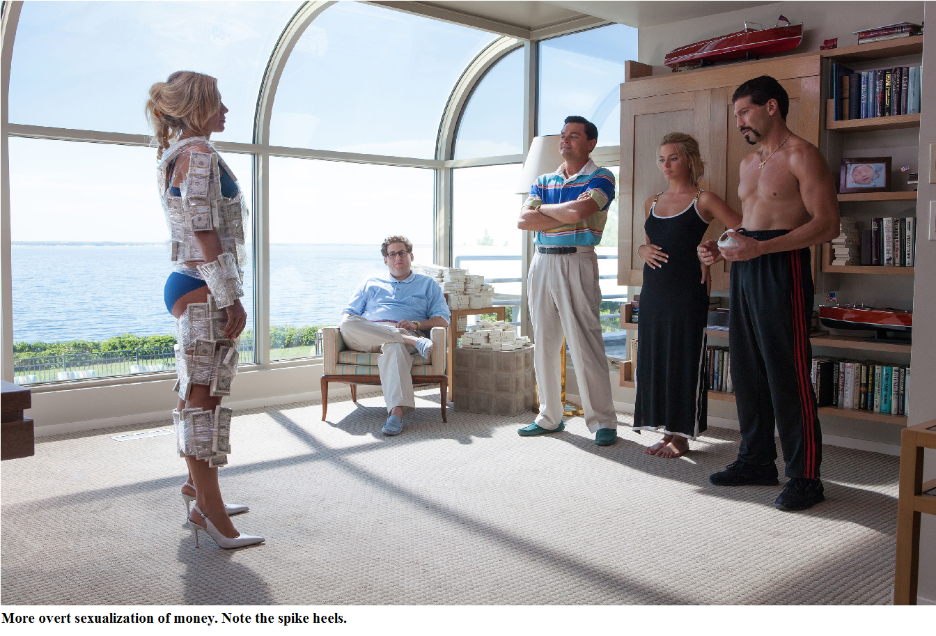 After moving into a bigger office, Belfort’s company has a small army of hookers constantly on call. During one segment, the audience is seeing the hookers objectified and mated with1 and hearing Belfort classify them as blue chips, NASDAQs and pink sheets — the same categories into which he puts stocks.