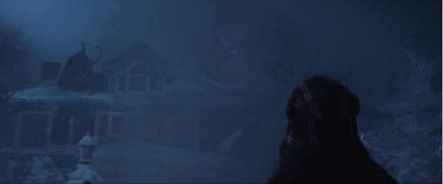 There’s also an interesting, underplayed Christmas Carol theme, particularly in the Krampus’ first appearance, pictured below, and his last in this scene. In the first scene, he flies from rooftop to rooftop, rattling the chains he’s covered in, distinctly evoking Jacob Marley. In this last confrontation, he looms over Max and just kind of points at things, distinctly evoking the Ghost of Christmas Yet to Come. Photos courtesy Universal Pictures.