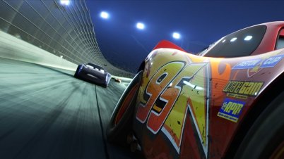 Cars 3 makes heavy use of shots like this, in which the camera seems to be fixed to the car the way one would be in a live-action production. They bring the audience low into the action, giving a startling realism and intensity to the film’s race scenes.