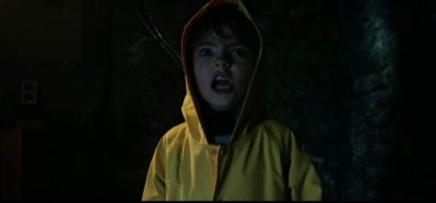 In the first scene in which Georgie is killed, you’ve got the soft children’s choral music popularized in The Conjuring movies playing over the production logos, then the opening credits play over tight close-ups of Billy constructing a paper boat, which is straight out of every creepy doll horror movie ever made, most recently the Annabelle franchise. Then, the movie almost immediately transitions to a fake-out jump scare scene as Georgie goes down to the basement. This sort of thing is super lame and in a ton of modern horror movies, but this scene in particular was done almost exactly in the first Conjuring as well. Finally, after a discussion with Pennywise, the scene ends with that dragged-away-from-the-camera shot made famous by the first Paranormal Activity.