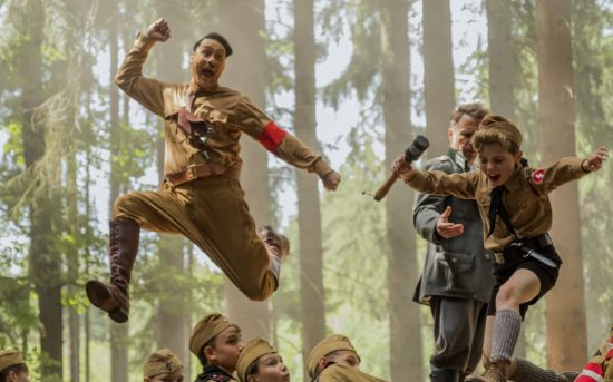 There’s a running gag where characters will express their enthusiasm for Nazism by forming a swastika with their bodies, like Taika Waititi’s imaginary Hitler does here. Image courtesy Fox Searchlight Pictures.