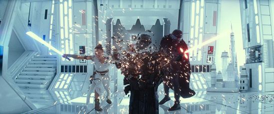 It’s “saber,” not “lightsaber.” The word “lightsaber” is never used in Rise of Skywalker, for some reason. Also, they each have a weird reluctance to hold their weapons with more than one hand, which is the opposite of the original trilogy when George Lucas insisted that all characters would need two hands to control the energy coming out of them. It’s not a “new is bad” thing, but it’s noticeably weird in moments where leverage matters and they’re not applying it.