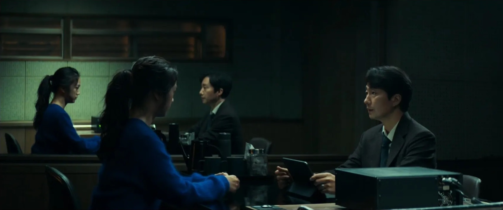 The camera movement, onscreen digital technology and extensive use of invisible VFX behind the scenes, which are used to create its many astonishing mirror shots, combine explosively. The most mind-bending moment for me is late in the film when a shot of Song, recorded on a pixilated screen during a lie-detector test, pushes in seemingly through the pixels to a direct close-up of Song, then pulls out back to the pixilated screen.