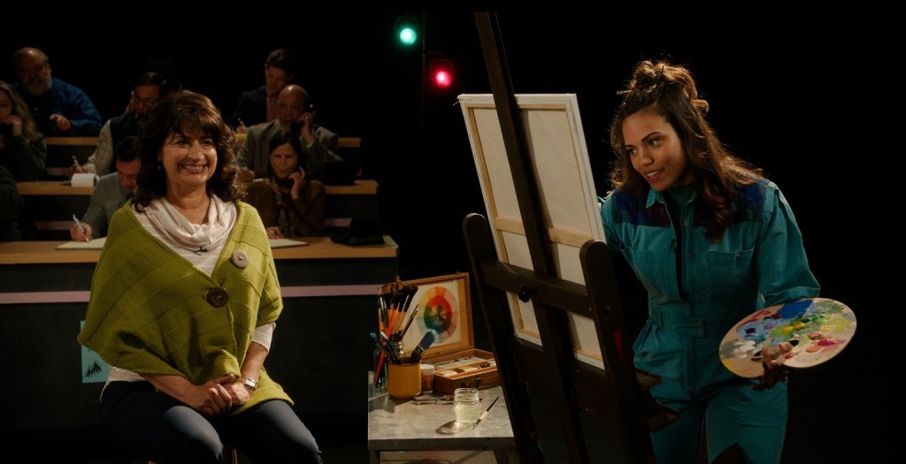 Nargle subtly exists outside of time, another way Paint insightfully reinforces its themes and spends incredible artistic ambition on, essentially, a running gag. Everything about the character, from his hair to his paintings, represents his stagnation as a person, which is both extremely profound and extremely silly and one never once compromises the other. Technology seems to vary between individual characters – Nargle doesn’t appear to have a phone and Katherine (Michaela Watkins) is shown taking calls on a rotary – though it only explicitly comes to a head when Jenna (Lucy Freyer) orders an Uber and Nargle says he doesn’t know what that is.